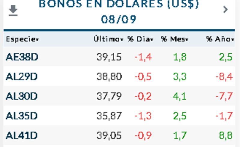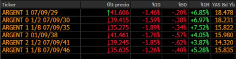 Entre los emitidos bajo jurisdicción doméstica tampoco hubo nada bueno para destacar. El AE38D perdió 1,4% y lideró las pérdidas. El AL30D, salió casi ileso, al caer apenas un 0,2 por ciento.