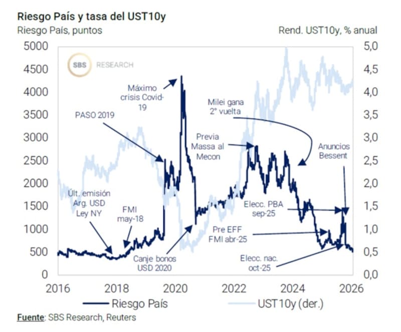 Por lo tanto, la compresión de spreads ha sido importante permitiendo alcanzar un riesgo país debajo de los 500 puntos, contemplando que antes de las elecciones se ubicaba en 1100 puntos.