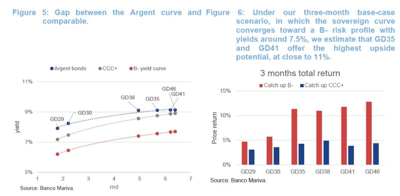 “En conjunto, estos factores deberían impulsar una mayor compresión del riesgo soberano desde los niveles actuales. En un escenario a tres meses en el que la curva soberana se normaliza a una calificación crediticia B- con rendimientos cercanos al 8%, GD35 y GD41 ofrecen el mayor potencial de crecimiento, en torno al 17%”, detallaron.