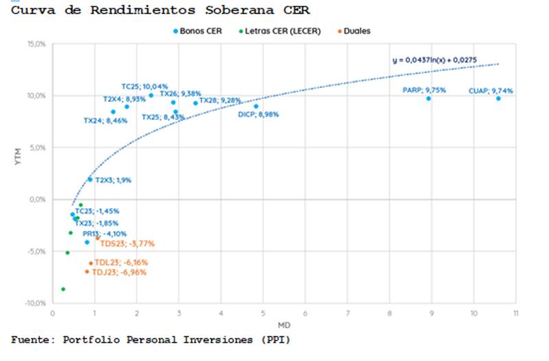 "Mantener duration corta luce aconsejable, sobre todo con opciones que rinden muy cerca del CER (con spread no tan negativo como antes) en el tramo medio de la curva, es decir, de marzo, abril y mayo. También surgen como una opción los Duales a junio por ejemplo. Si bien estos bonos lucen caros en comparación tanto con la curva CER como la curva dolar linked, la opcionalidad posee un valor que puede estar incluída en el precio", sostuvo.