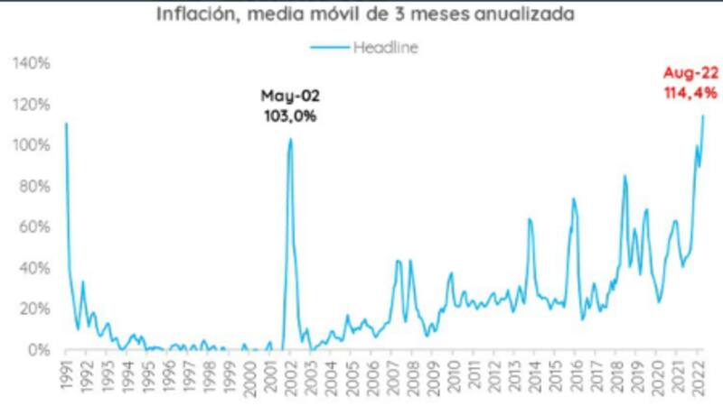 El último dato de inflación fue peor de lo esperado ya que arrojó un 7% mensual en agosto, alcanzando el 56,4% en lo que va de 2022 y 78,5% interanual.