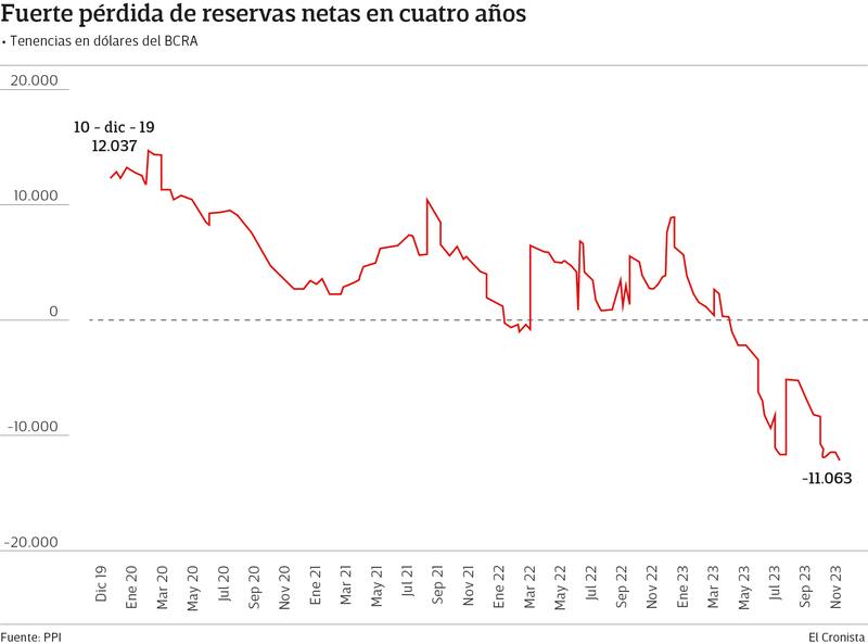 La pesada herencia que recibirá Javier Milei del gobierno de Alberto Fernández se refleja, entre otros aspectos, en las reservas negativas del Banco Central, que están en mínimos históricos tras cuatro años de fuertes pérdidas, las cuales deberá recomponer para abrir margen en su objetivo de eliminar las restricciones cambiarias y sanear la economía.