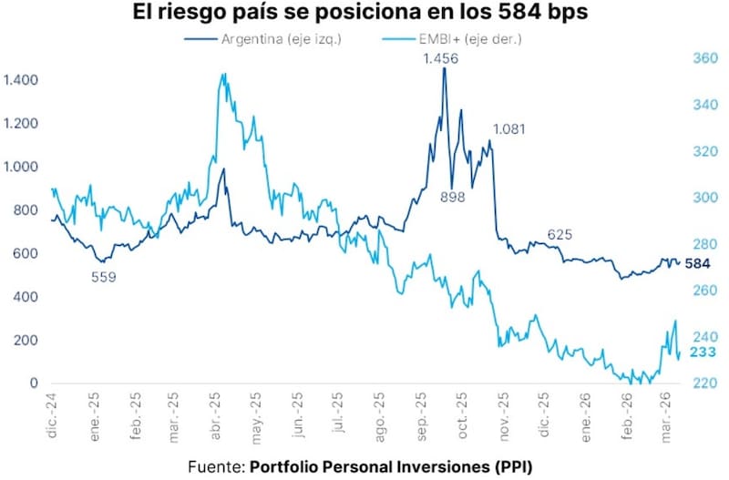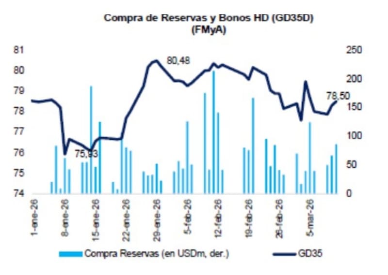 Pese a este importante ritmo de compras y acumulación de divisas, los bonos han operado a la baja, haciendo que el Riesgo País se ubique casi 100pbs por encima de los mínimos de enero de 2026.