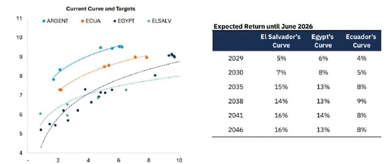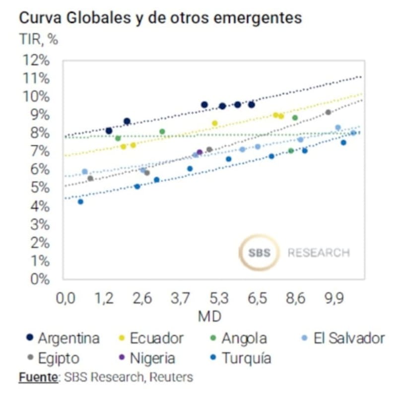 Hoy la curva soberana argentina opera con tasas por encima de sus comparables, tales como Ecuador, Nigeria, Angola, Egipto o El Salvador.