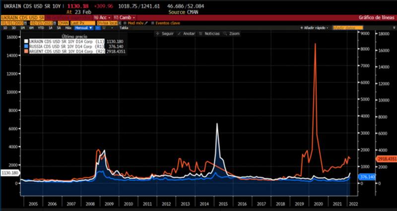 Es decir, a un banco o fondo de inversión global le resulta más costoso cubrir una posición de bonos argentinos usando sus respectivos credit default swaps (CDS) a 5 años que si intenta cubrir su posición de bonos de Ucrania o Rusia con sus respectivos credit default swaps al mismo plazo (CDS).
