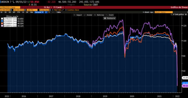 Los bonos globales de Ucrania perdieron entre 45% y hasta 56% en el último mes y desde sus máximos recientes. Pasaron de operar en niveles de u$s 100 hace un mes para operar en niveles de entre u$s 40 a u$s 50.