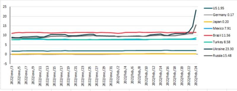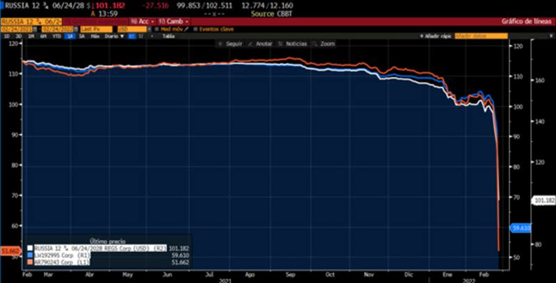 Un impacto negativo similar se observa en la deuda rusa, la cual sufre una perdida de entre 54% y 40% a causa del inicio de la guerra con Ucrania.