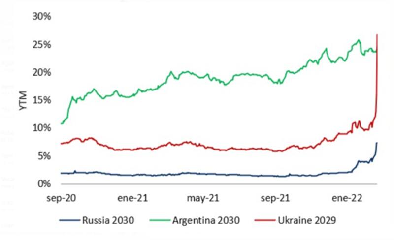 Lo que resulta interesante es que, aun con el ajuste actual de los bonos de Ucrania y de Rusia, la deuda de estos países rinde menos que los bonos de Argentina.