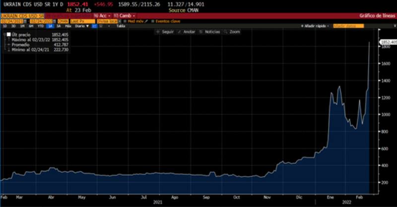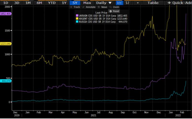 Los CDS de Ucrania a un año se dispararon a u$s 1852 y superan a los de Argentina que valen u$s 1223. En cambio, los de Rusia aun se mantienen en niveles más bajos, en u$s 444.