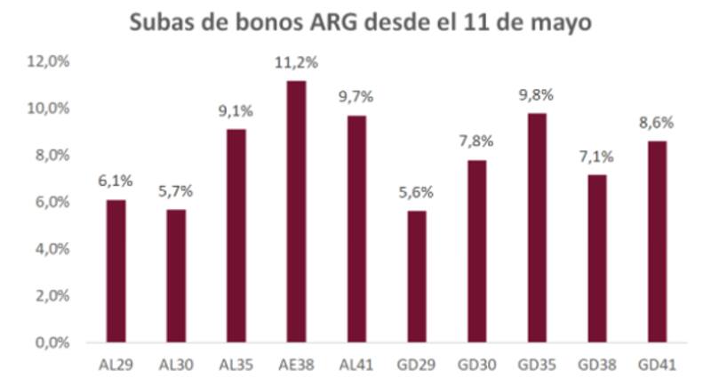 Según datos de Cohen, en donde mayores subas se dieron fue en el Bonar 2038, que gana un 11%, seguido por el Global 2035, que avanza 9,8%, y el Bonar 2041, que gana 9,7% desde el piso de mayo pasado.