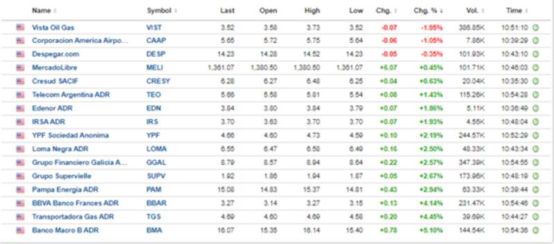 Del lado perdedor, solo las acciones de Vista Oil, Corporación América y Despegar operan a la baja con caídas de 1,95%, 1% y 0,35% respectivamente.
