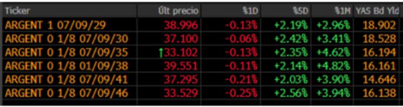 En lo que respeta a los bonos, todos los tramos de la curva soberana argentina operan con leves bajas el viernes. En la parte más corta se ven caídas leves de 0,13% y de 0,06% para los Globales 2029 y 2030, mientras que en el tramo medio y largo los retrocesos son de 0,1% y hasta 0,25%.