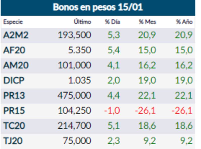 Los bonos que ajustan por Cer como Boncer 20 y Boncer 21 suben 18,6% y 9,2% en 2020 mientras que, más largo en la curva, los bonos PR13 y DICP ganan un 22% y 19% respectivamente. Los bonos A2M2 y AF20 suben 20,9% y 15% respectivamente en los primeros dias del año. Este avance hizo que los bonos locales muestran mejores niveles de paridades respecto de lo que se encontraba hace un mes atrás.