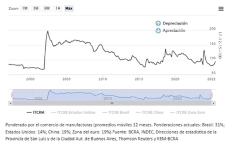 "A pesar de que el tipo de cambio se alejó del techo la banda estas últimas semanas, todavía estamos por debajo de niveles muy altos de competitividad. El FMI, en el reporte de abril sugirió que el TCRM tenía que estar en un 15% a 25% arriba de lo que era el primer trimestre de 2025, es decir, entre 93 y 100. Hoy estamos en 92, con lo cual estamos dentro de un rango aceptable, pero todavía no estamos en rangos muy altos de competitividad", sostuvo Bagilet.