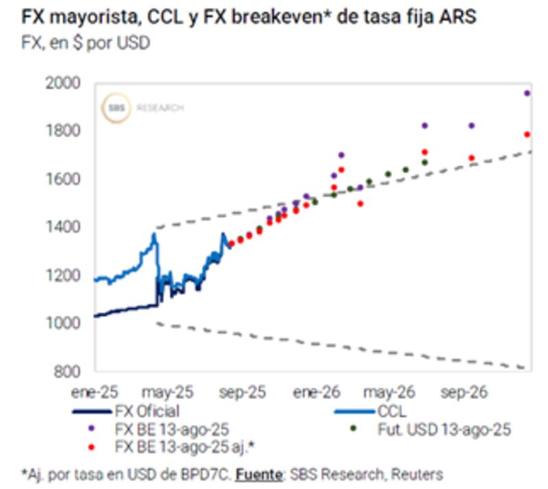"Las estrategias de pesos que recomendamos son Lecap con vencimientos en septiembre y octubre (T17O5), que tienen TNA de entre 48 y 49% aproximadamente, y un tipo de cambio MEP de equilibrio o break-even en torno a $1370 a $ 1400, lo cual, aparecen bastante razonables", detalló Bagilet.