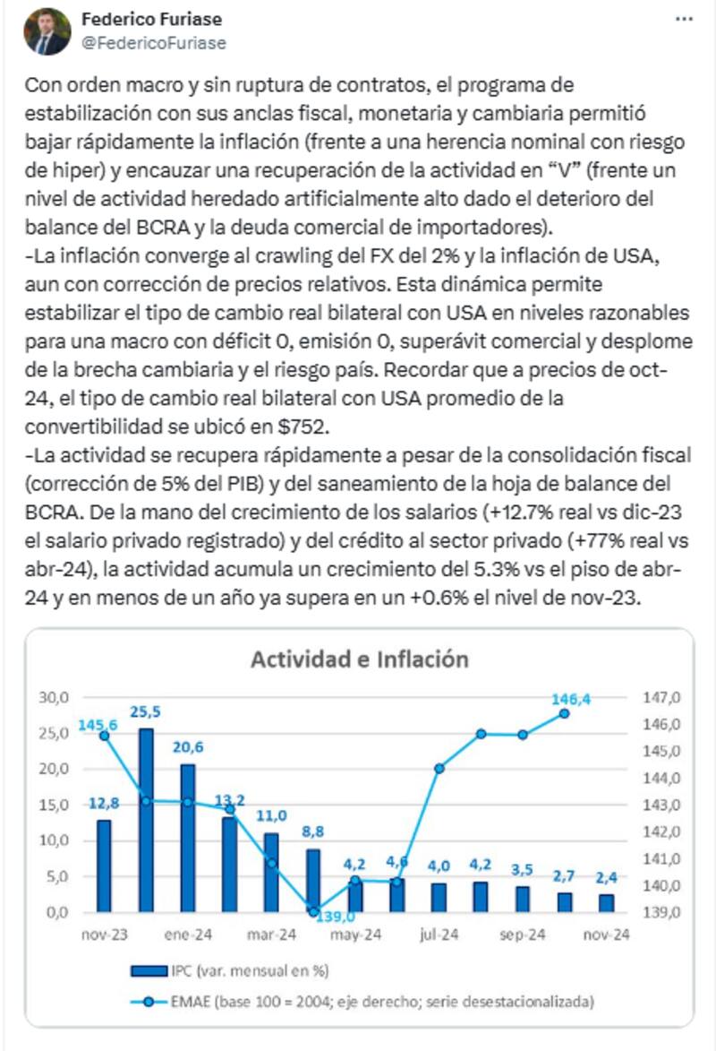 Federico Furiase, director del BCRA y asesor de Luis Caputo, destacó en un posteo en la red social X que "la inflación converge al crawling peg del 2% y la inflación de EE.UU., aun con corrección de los precios relativos. Esta dinámica permite estabilizar el tipo de cambio real bilateral con EE.UU. en niveles razonables para una macro con déficit cero, emisión cero, superávit comercial y desplome de la brecha cambiaria y el riesgo país. Recordar que a precios de octubre, el tipo de cambio real bilateral con EE.UU. promedio de la convertibilidad se ubicó en $ 752".
