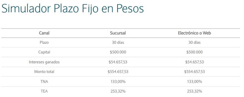 Por lo tanto, si un usuario decide invertir $ 500.000 obtendrá de intereses ganados, en un periodo de 30 días, un total de $ 54.657,53, según el cálculo que realiza el simulador de plazo fijo en pesos del Banco de la Nación Argentina (BNA).