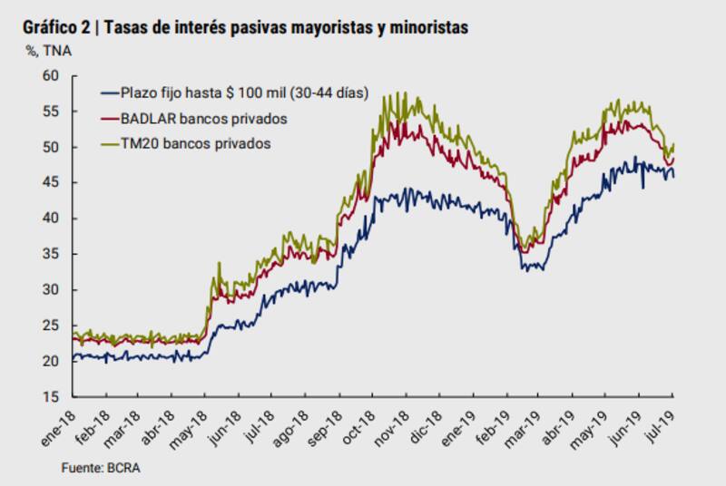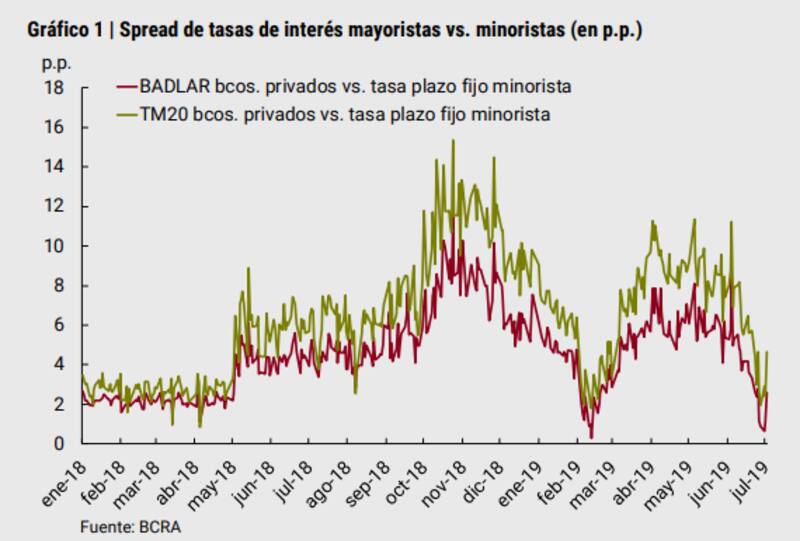 “El diferencial entre la tasa de interés de plazos fijos mayoristas y minoristas cayó de manera significativa entre principios de abril y mediados de julio. Los spread entre la tasa Badlar y la TM20 de bancos privados con respecto a la tasa de plazos fijos de menos de $ 100.000 bajaron 4 puntos porcentuales y 6 puntos porcentuales, respectivamente. También se redujo el spread entre la tasa de referencia (Leliq) y la tasa minorista, en unos 9 porcentuales en el mismo lapso , abundó el informe oficial.
