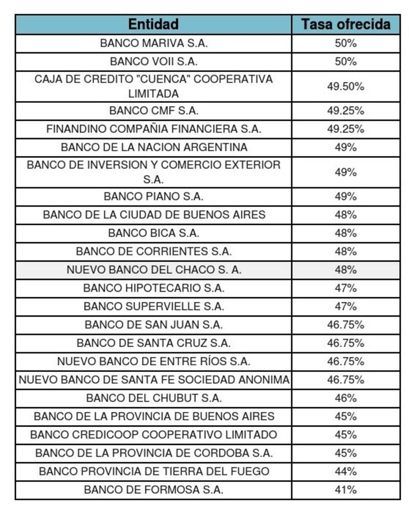 Con el Banco Nación algo más moderado en su remuneración, hoy los dos bancos que más tasa nominal ofrecen son Banco Mariva y Banco Voii, con el 50%. En promedio, las 24 entidades que ofrecen la posibilidad de hacer plazos fijos a no clientes pagan en promedio 47%, con mínimo en 41%.