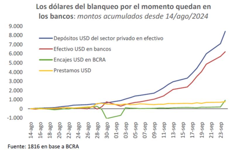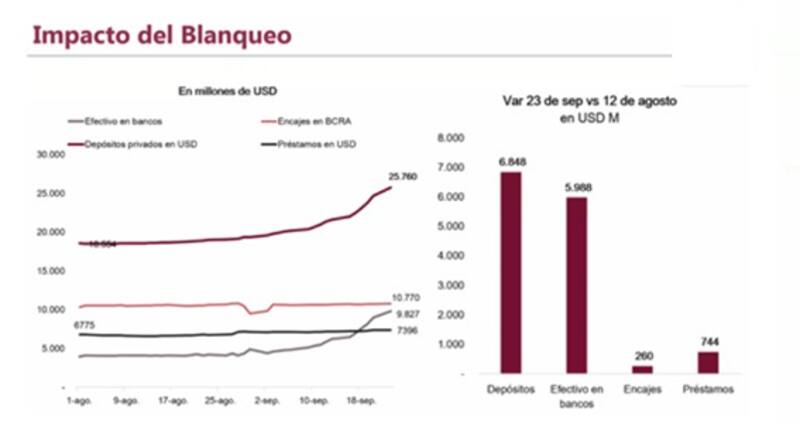 En ese sentido, agregó que, una vez pasada esa fecha, y aún con la ventana inicial del blanqueo abierta hasta el 31/10, los bancos podrán empezar a buscarle destino a esos depósitos en dólares.