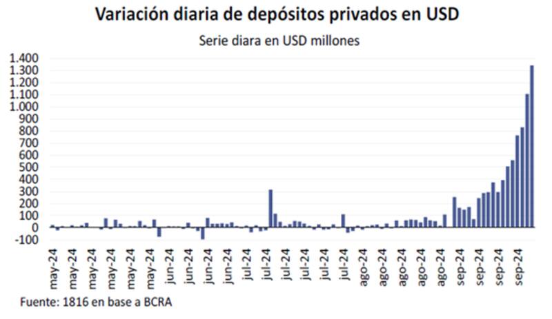"Así se podría abrir una nueva opción para canalizar los fondos provenientes del blanqueo además de las colocaciones de ON que se aproximan. Se espera que los depósitos en dólares del sector privado sigan aumentando durante octubre ya que la primera etapa del blanqueo se extendió hasta fin de octubre", anticiparon.