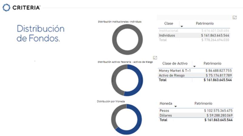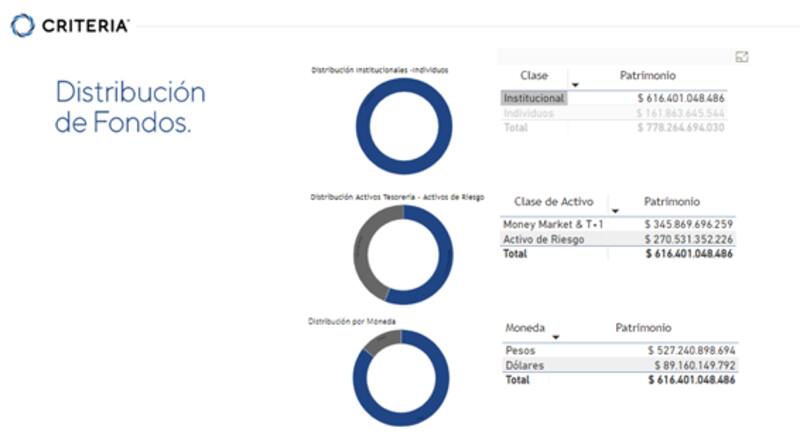 Los inversores institucionales dentro de la industria representa un total de $616.401 millones. De ese monto, el 56,2% esta invertido en fondos comunes de inversión de mercado de dinero (money market), es decir, $345.869 millones. El restante 43,8% esta invertido en fondos de activos de riesgo. A su vez, el 86% de ese total está invertido en fondos de pesos ($527.240 millones) y el restante 14% ($89.160 millones) en fondos que invierte en activos en moneda dura.