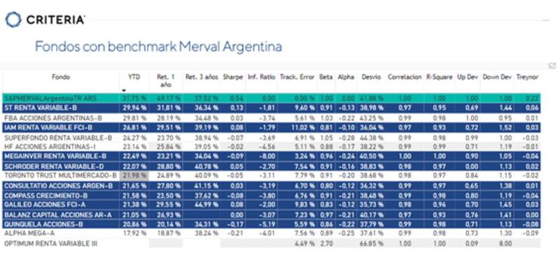 Con datos de Criteria, el S&P Merval Argentina ganaba, al cierre de junio, un 31,75% en 2019, mientras que el fondo dentro de dicha categoría que mayores ganancias registraba a la misma fecha era ST Renta Variable, ganando un 29,94% en el primer semestre. Entre los 3 fondos que mayores ganancias acumuladas en el año ofrecían eran FBA Acciones argentinas, ganando en 2019 un 29,81%, IAM renta Variable, sumando un 26,8% desde enero.