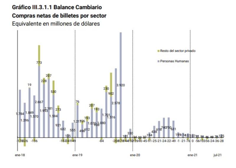De esta forma, las personas compraron de forma neta u$s 125 millones para atesoramiento con un aumento de 65% respecto al mes previo. El incremento en forma neta fue mayor porque subió la cantidad de compras y cayó la de ventas respecto a junio.