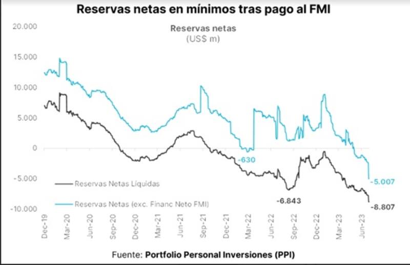 Además, desde PPI estimaron que, "bajo el supuesto que el BCRA tiene un resultado neutro en el MULC entre este miércoles y viernes, las reservas netas se hundirían a alrededor de - u$s 6014 millones si no llegan los desembolsos del FMI".