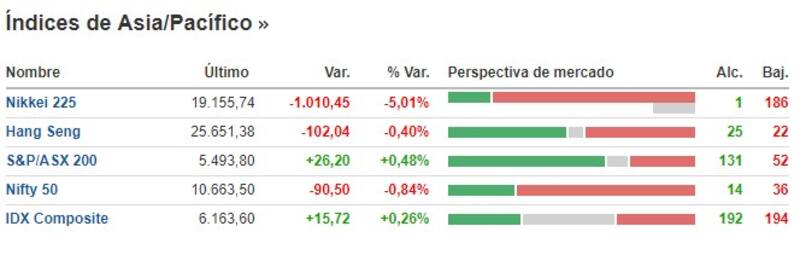 Igualmente afectado por un fuerte aumento del yen -lo que perjudica a los exportadores japoneses-, el índice Nikkei 225 cayó más de 5%, hasta su nivel más bajo desde abril de 2017.