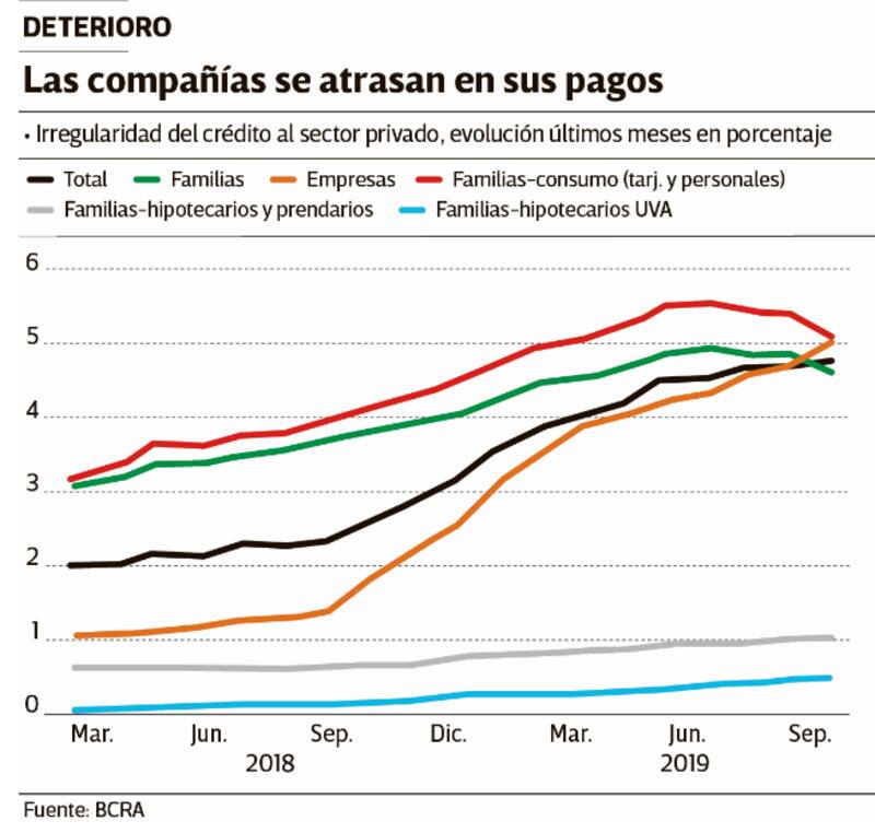 Según el último Informe de Estabilidad Financiera publicado por el Banco Central (BCRA), la mora en préstamos corporativos volvió a subir 0,3 puntos porcentuales en septiembre (último dato disponible) y llegó a 5% de las financiaciones totales a empresas.