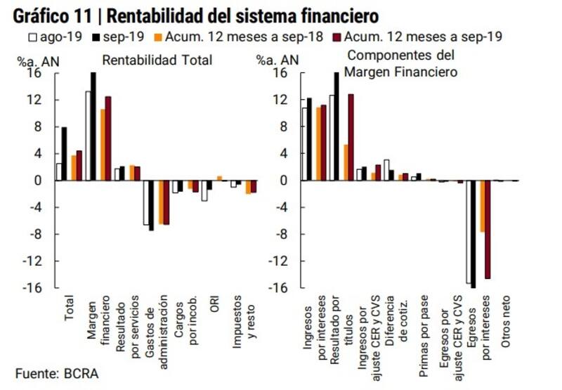 Dentro de los elementos que componen la rentabilidad bancaria, el margen financiero fue el que más se destacó en el mes, ya que se ubicó en 16,9% del activo, 3,6 puntos porcentuales más que en agosto. "Mayores ganancias por títulos valores e intereses por préstamos explicaron el aumento mensual", sostuvo la autoridad monetaria en su Informe sobre Bancos.