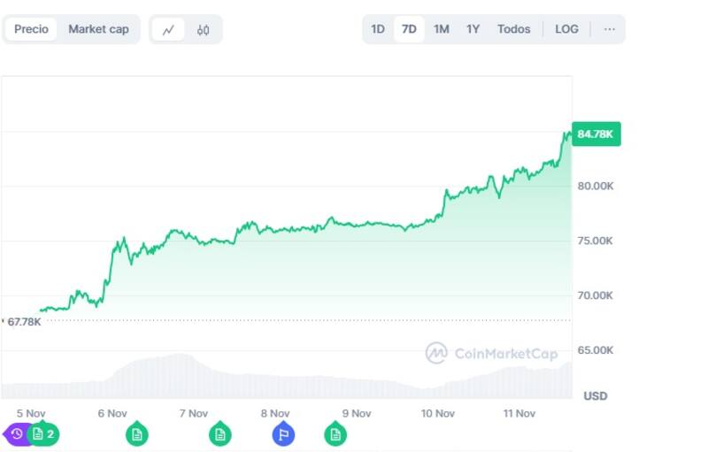 Bitcoin volvió a marcar un nuevo máximo histórico y en la última semana está superando a todos los activos financieros. Desde la elección de Donald Trump en los Estados Unidos, la criptomoneda con mayor capitalización de mercado subió 28% en dólares. Así, pasó de u$s 67.700 el martes 5 de noviembre a superar este lunes los u$s 87.000.