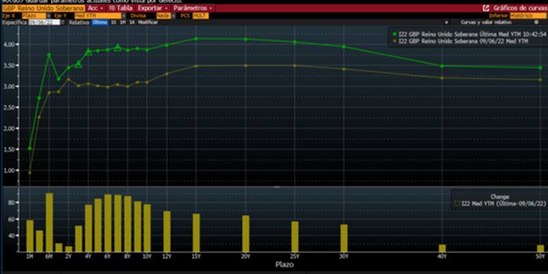 Los bonos del Tesoro de Reino Unido se desplomaron a lo largo de este año. Desde que asumió Truss, se desplomó en promedio 12% en los distintos tramos de la curva, y llegó a perder cerca de un 25% desde los techos de marzo. Las tasas de su deuda se desplazaron al alza en todos sus tramos.
