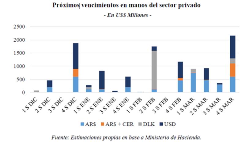 “Para tener un orden de magnitud, los vencimientos de deuda en los primeros tres meses del año acumulan u$s 15.000 millones, sumando intereses y capital en pesos y en moneda extranjera, ya sea con el sector privado o con organismos internacionales. La caja con la que comenzará el Tesoro el año que viene será prácticamente nula y las reservas internacionales netas del BCRA, si bien frenaron su caída (e incluso subieron en el margen) son de apenas u$s 11.500 millones , explicó Francisco Mattig, analista de estrategia de Consultatio Investment.