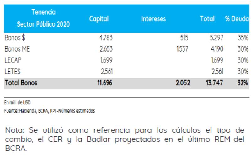Cuando se consideran la deuda en 2020, la misma alcanza un total de u$s 42.886 millones entre capital e intereses. De ese total, el 58% corresponde a capital e intereses de bonos, un 29% en letras y 13% en organismos internacionales.