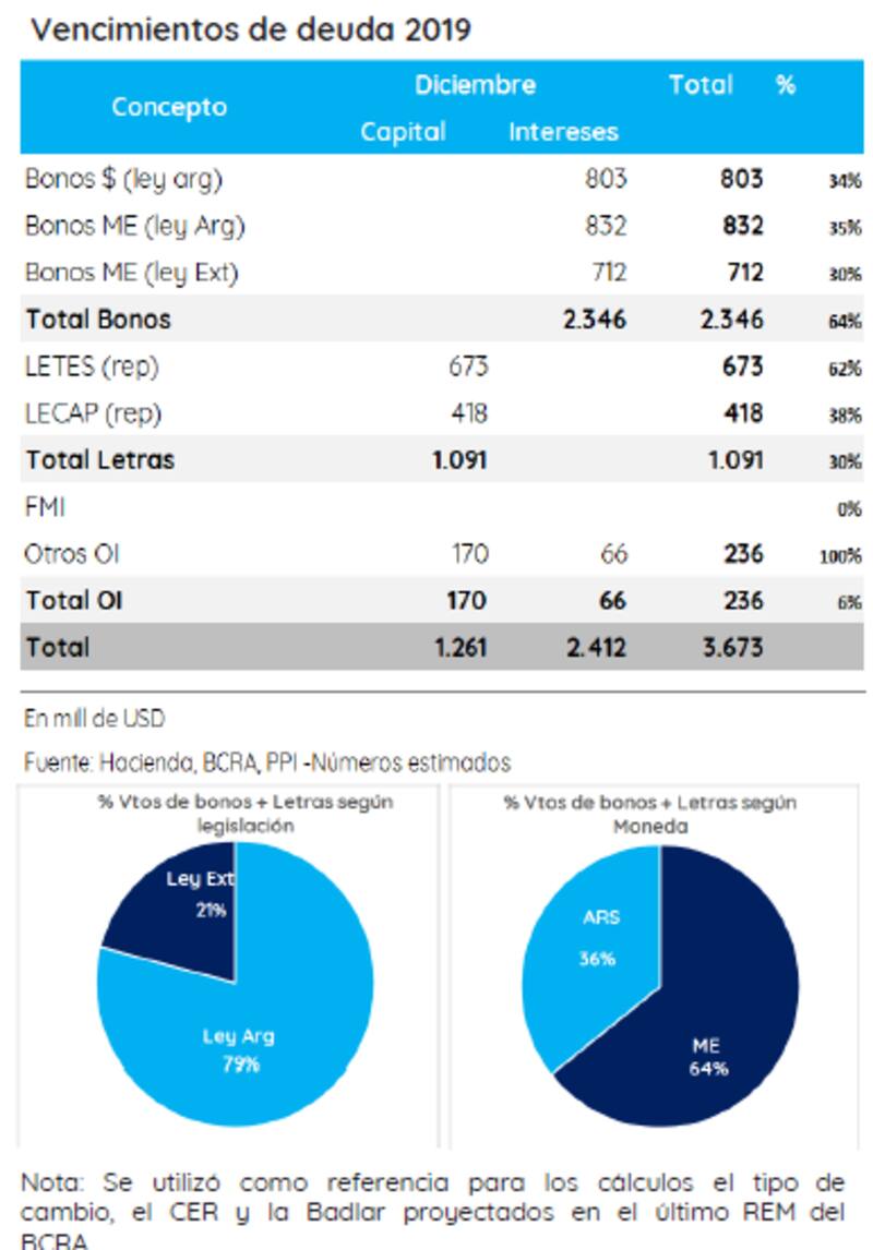 Los analistas de Portfolio Personal Inversiones (PPI) detallaron que en lo que resta de los compromisos de deuda en 2019, el 79% corresponde a ley argentina y el 21% restante a ley local. A su vez, el 64% del total es deuda en moneda extranjera y 36% en pesos. Haciendo foco sobre las Letras reperfiladas, el 62% corresponde a Letes (u$s 673 millones) y el 38% restante en Letras en pesos (Lecap).