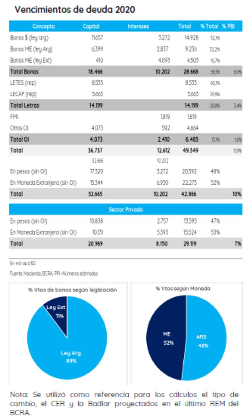 “Un dato clave de esta foto es cómo se divide estos vencimientos entre el sector público y privado. Los primeros no tienen problema de renovación a cada vencimiento. Sin el sector público, los cerca de u$s 43.000 millones, se reducen a unos u$s 29.120 millones. Es un 32% menos de los vencimientos totales mencionados. En términos de PBI esto es un 7% (poco más de 2 puntos de intereses y 5 de capital). Asi, los vencimientos de capital considerando las letras, en manos privadas son unos u$s 20.970 millones, y los intereses unos u$s 8150 millones , explicaron desde PPI.