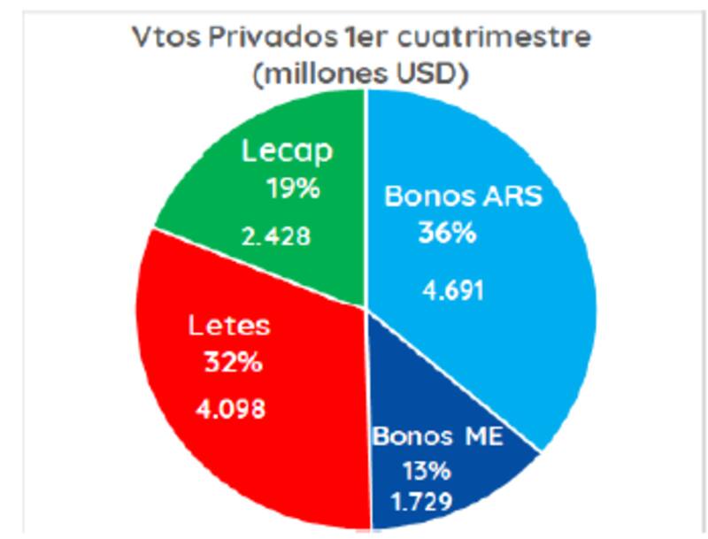 De los vencimientos del 2020 el 45% se concentra en los primeros cuatro meses. Esto explicado principalmente por los pagos de letras reperfiladas, que representan el 50%, de los cerca de u$s 13.000 millones que vencen. El 19% del total corresponden a Lecap, 32% a Letes, 36% en bonos en moneda local y 13% en bonos en moneda extranjera.