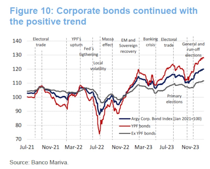 El índice de deuda corporativa argentina muestra una ganancia de 36% desde julio de 2022, por lo que los bonos de YPF tienen una performance bastante superior.