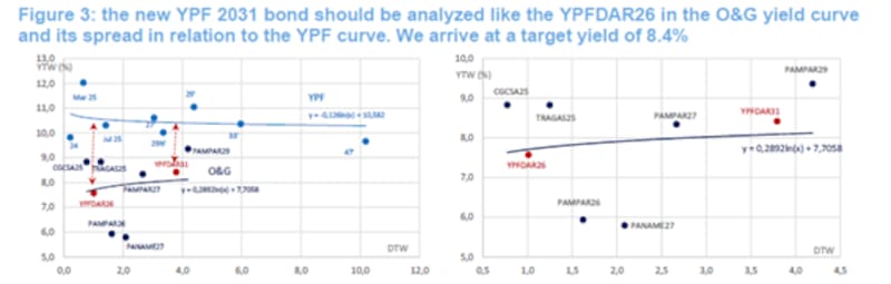 "Con respecto a estos bonos, considero que quedaron algo baratos con respecto a la actual curva de YPF y también si lo vemos también con emisiones con duration similares como Aeropuertos Argentina, Albanesi o Masterone 2026 y 2027", sostuvo.