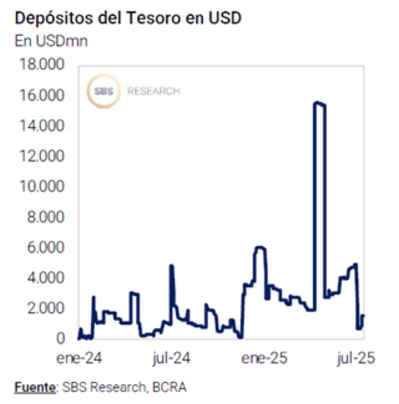 Según explicaron desde Grupo SBS, Los depósitos en dólares del Tesoro se van recomponiendo tras el pago de bonos soberanos de comienzos de julio, tanto por compras en bloque como por desembolsos de organismos internacionales de crédito.