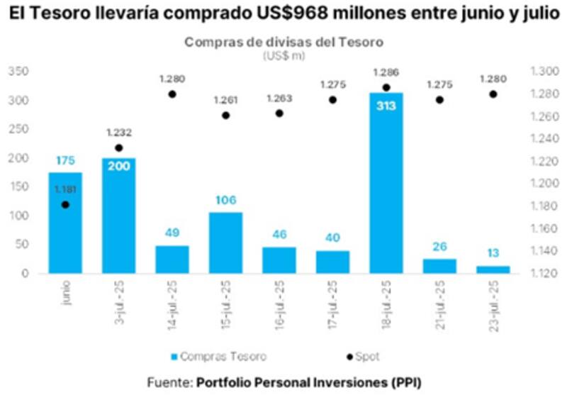 "Según nuestros cálculos, el Tesoro compró alrededor de u$s 990 millones entre junio y el fin de julio, a un spot promedio de $ 1252", afirmaron desde PPI.