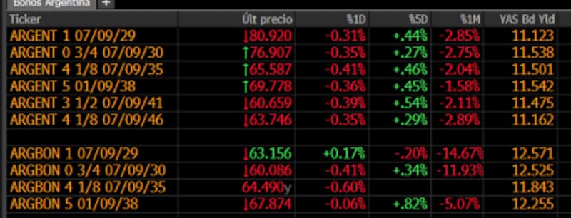 El jueves, mientras el dólar en Argentina roza los $1350, los bonos operaron con leves bajas, de 0,3% en promedio. El viernes, la deuda recorta posiciones y cae 0,3%, aunque se mantiene cerca de sus máximos.