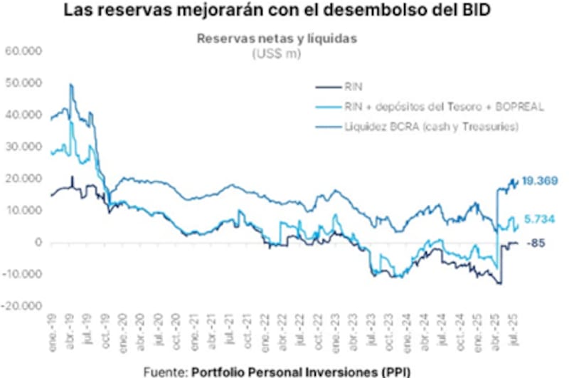 "Si bien el desembolso pendiente del FMI no contabiliza para la meta de reservas, el del BID sí. Con los fondos del BID, estimamos que la liquidez del BCRA mejorará de u$s 18.398 millones al 25/07 a u$s 19.389 millones. Con el desembolso a ingresar del FMI, las reservas líquidas treparían a los u$s 21.400 millones, el nivel más elevado desde septiembre 2019", indicaron.