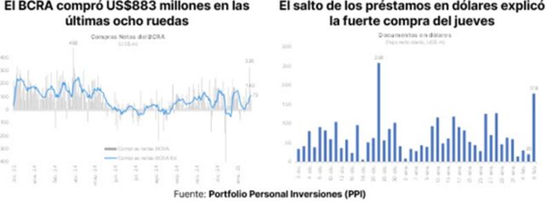 "Si bien el BCRA continúa adquiriendo divisas en el MULC, notamos que su ritmo de compras desaceleró respecto al jueves y viernes pasado, cuando se hizo con u$s326 millones y u$s140 millones, respectivamente. Buena performance del jueves fue producto de una aceleración de la oferta financiera", comentaron desde Portfolio Personal Inversiones (PPI).