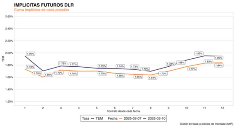 La misma estabilidad se percibe en la curva de dólar futuro, en la que el mercado no ve eventos disruptivos. Los inversores estiman que el ritmo del crawling peg se mantendrá debajo del 2% este año, lo cual también confirma que el mercado descarta que ocurra algún escenario de estrés cambiario en el tipo de cambio oficial.