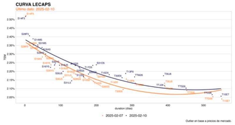La curva de Lecap opera con tasas de 2,4% en el tramo corto, cayendo a niveles de 2,1% en el tramo medio y largo. La misma se muestra invertida, lo cual refleja el interés de los inversores de alargar duration.