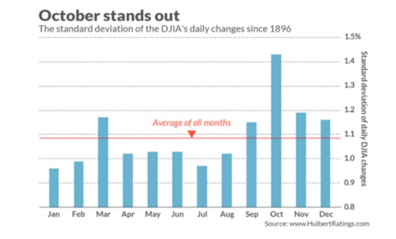 En la volatilidad de octubre se dieron las dos peores caídas del mercado de valores en la historia de Estados Unidos, 1929 y 1987. Octubre es el mes más volátil del calendario, incluso si no se inlcuyen esos dos años en el cálculo.