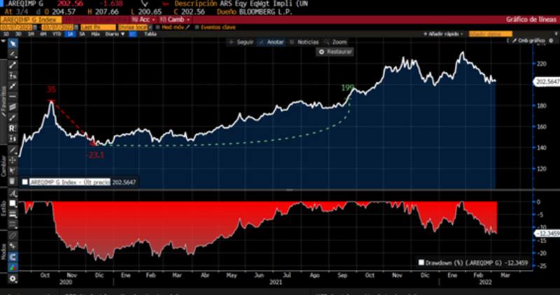 "El primer factor se trata principalmente de un aspecto local, debido al gran avance que hubo respecto a las negociaciones con el FMI, sumado al "staff level agreement on an extended fund facility" publicado a principios de marzo. El segundo factor se debe principalmente a la guerra entre Ucrania y Rusia que provocó una gran suba en los precios de los commodities e impactó de lleno en el PxQ de las liquidaciones del agro", afirmó